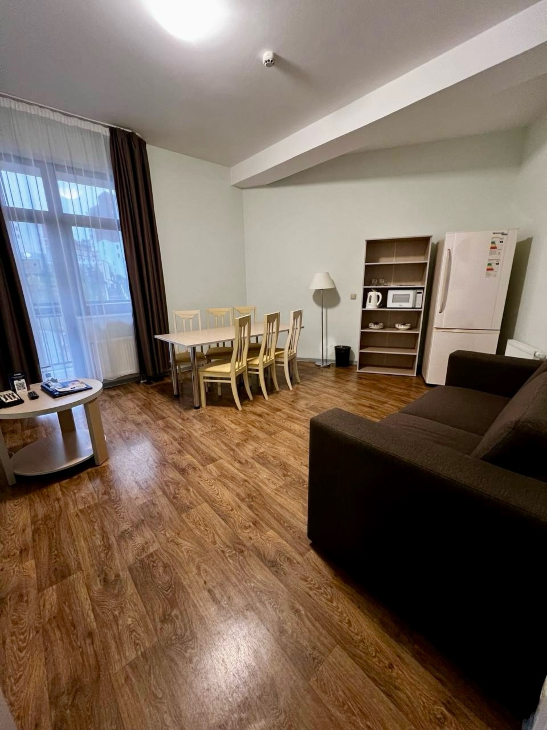 Номер без кондиционера, но нам и не надо было так как были осенью и было свежо на улице, номер чистый, 2х комнатный. Есть все банные преднадлежности, собой брали только зубные щетки и пасту. В каждой комнате есть телевизор, а также небольшой холодильник. Парковка возле дома, 550 рублей сутки. Вид из окна с четвертого этажа просто пушка. Также в номере есть чайник и микроволновка. Все супер.
